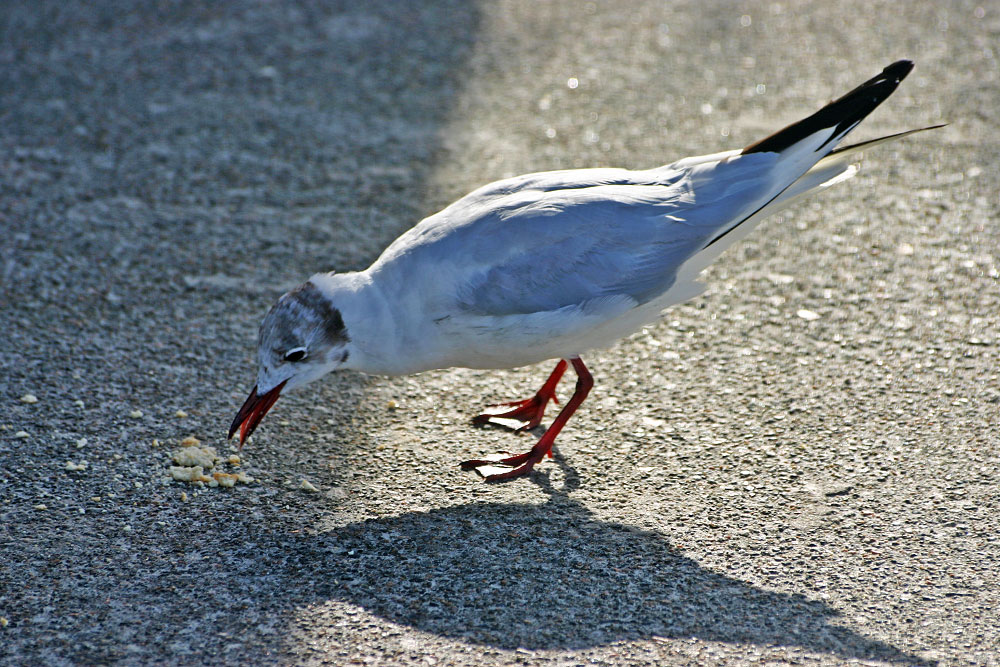 Wenn es ums Fressen geht, sind Möwen gründlich. Fein säuberlich pickt das Exemplar auf diesem Foto den klein getretenen Butterkeks von der Strandmauer und läßt ihn sich schmecken.