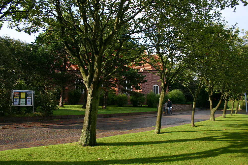 Das Straßendreieck vor der evangelischen Nikolaikirche besteht aus schön kurz gemähtem Rasen sowie alleeartig angelegten Baumreihen. Eine hübsche, idyllische Ecke Wangerooges, auf die viele Leute gar nicht bewußt blicken.