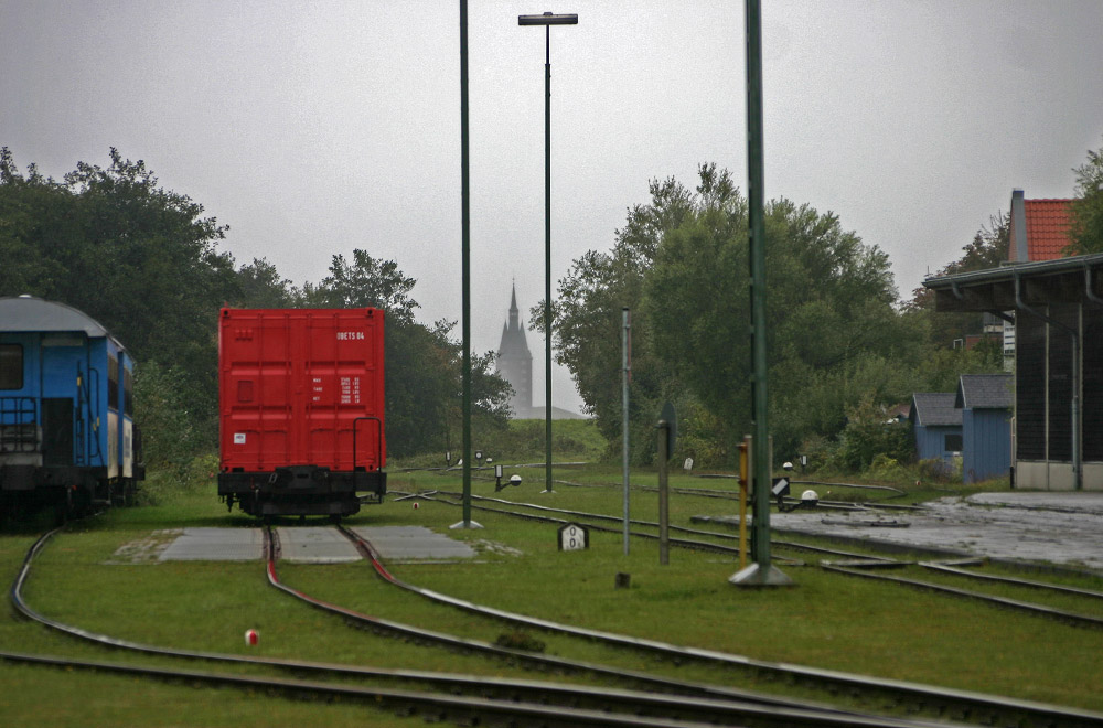 Durch eine kleine Lücke hindurch kann man vom Bahnübergang aus genau bis hin zum zum Westturm schauen. Dies ist allerdings nur vernünftig möglich, wenn sich auf dem Abstellgleis kein Zug befindet. Wenn gerade Betriebsruhe herrscht, ist dieser Blick also nicht möglich.