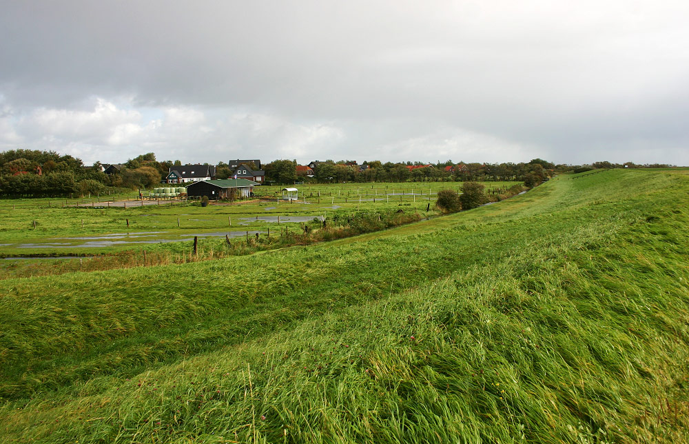 An dieser Stelle zweigt der alte Dorfgrodendeich nach links ab. Das Gelände, auf dem sich heute ein Wäldchen befindet, war vor 1962 noch nicht durch einen Deich geschützt.