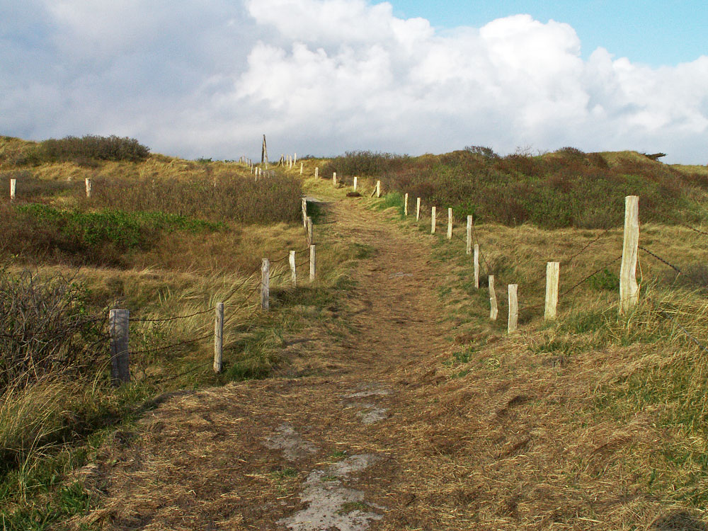 Die Dünen sind in Richtung Osten relativ breit, so daß die Dünenüberwegung eigentlich auch ein Dünenweg ist. Der »A-Mast« hinten im Bild markiert die Überwegung, so daß man sie schon vom Strand aus erkennen kann.