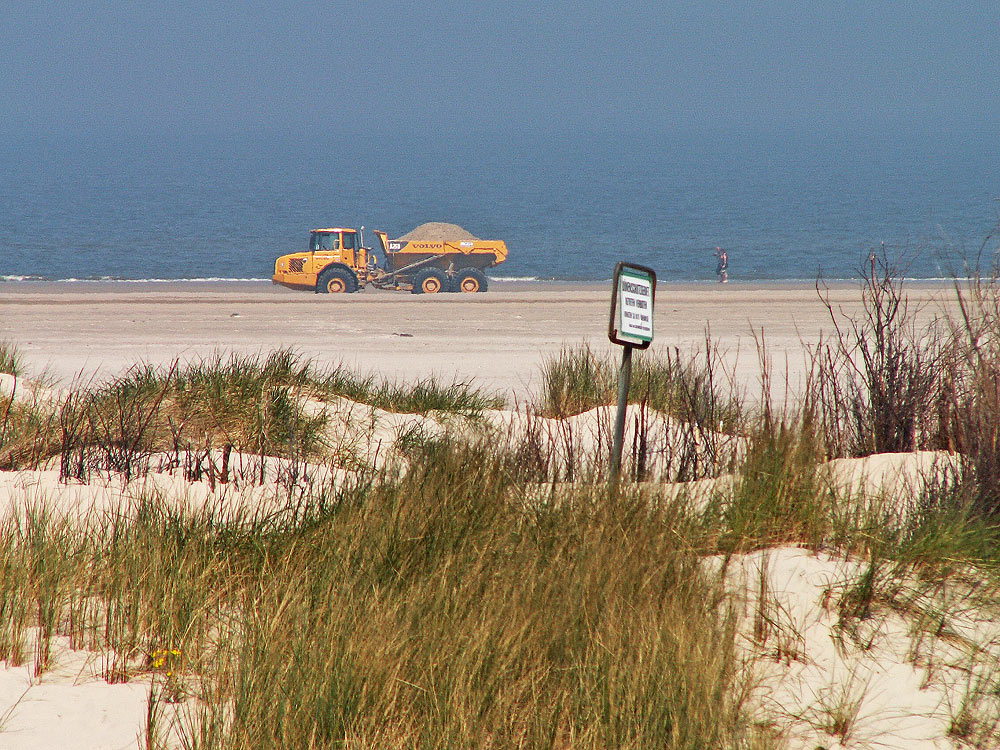 Noch mehr Sand paßt nun wirklich nicht auf die Ladefläche des Dumpers. Er ist auf dem Weg zum Hauptstrand, um dort das Strandniveau wieder zu erhöhen.