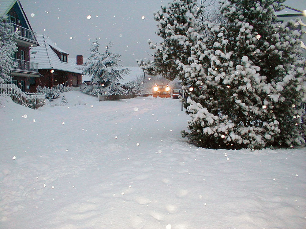 Hannes Gerdes ist auch schon mit seinem Räumfahrzeug unterwegs – oder genauer gesagt dem der Kurverwaltung. Es schneit allerdings immer noch weiter, was man an diesem Foto schön erkennen kann.