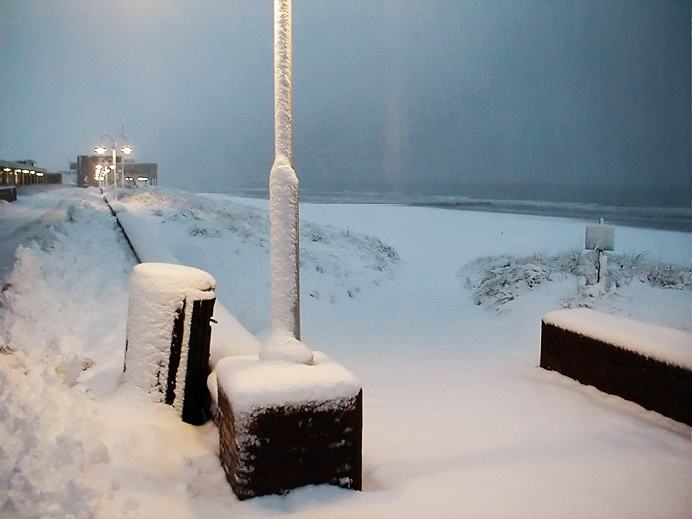 Es schneit immer noch weiter, wie man an den Schlieren im Licht erkennen kann. Hier zum Strand ist in der letzten halben Stunde keine Menschenseele hinunter gegangen, was nicht zuletzt am Wetter liegt. Dafür freut man sich bei dem Wetter umso mehr, nach dem Schneespaziergang zu Haue einen heißen Tee genießen zu können.