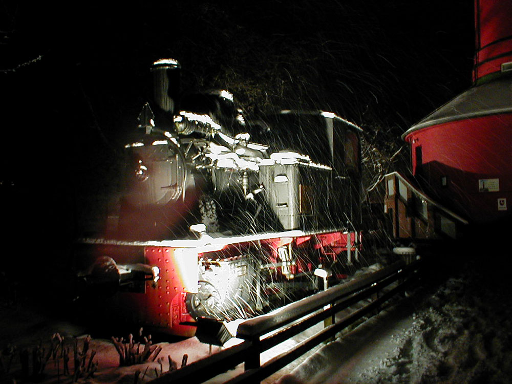 Auch um kurz nach halb Sieben schwirren die Schneeflocken noch durch die Gegend, in diesem Falle bei der ehemaligen Dampflok der Wangerooger Inselbahn (Lok-Nr. 99 211). Durch die starken Scheinwerfer, die abends den Alten Leuchtturm bestrahlen, sind die Flocken selbst auf dem Foto gut auszumachen.