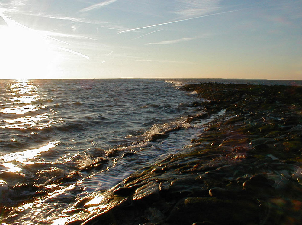 Wangerooges längste Buhne, die Buhne »H«, sehen Sie halbrechts auf dem Foto. Es ist heute recht kalt, so daß das Meerwasser bereits auf den Steinen zu frieren beginnt.
