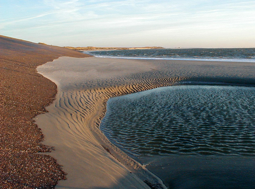 Auf dem Pril, der sich am Fuße des Südwestdeckwerks befindet, hat sich ebenfalls schon ein wenig Eis gebildet. Ansonsten ist das Sandrippel-Muster, das sich bei der tiefstehenden Sonne abzeichnet, natürlich ebenfalls sehr sehenswert.