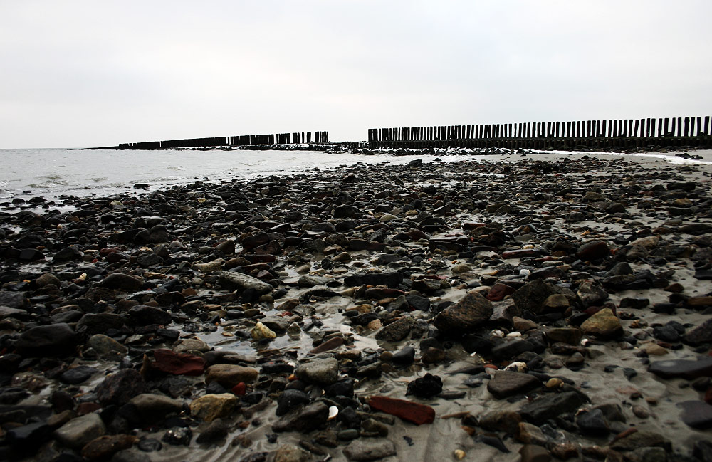 Diese ganzen Steine kommen nicht etwa aus der Nordsee (dort gibt es nur Sandboden), es sind vielmehr Überreste vom Deckwerksbau, von den Buhnen, von der ehemaligen Strandmauer oder aus dem alten Westdorf. Je nach Strömung gibt es hier mal mehr, mal weniger Sand, so daß man parallel dazu manchmal mehr und manchmal weniger von den Steinen sieht.