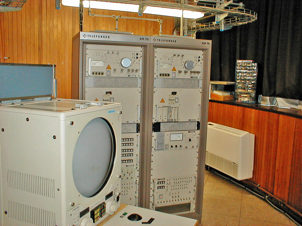 Wenn man dieses sogenannte »Sichtgerät« anschaltet, sieht man auf dem Bildschirm die vorbeifahrenden Schiffe sowie die Umrisse der Insel. Auf das Sichtgerät werden nämlich die Daten projiziert, die die Radaranlage »KR 75« (im Hintergrund zu sehen) liefert. Im Jahre 1974 wurde das System von der Firma AEG-Telefunken entwickelt, 1979 wurde der Wangerooger Turm dann damit ausgerüstet.