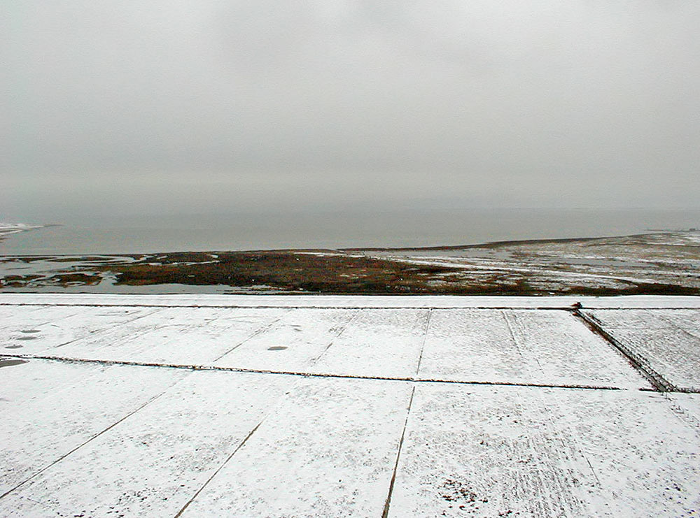 Wir schauen vom Neuen Leuchtturm aus in Richtung Osten und sehen den Westinnengroden mit verschneiten Weiden, dahinter den Westgrodendeich und wiederum dahinter die »Aalkuhlen«. Außerdem herrscht zur Zeit Hochwasser, die »Salinebucht« ist komplett überflutet.