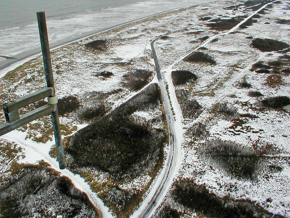 Den Verlauf der »Straße zum Westen« sowie des »Fußwegs zum Westen« kann man auf diesem Foto schön nachvollziehen: Während der asphaltierte Weg einen Bogen beschreibt, führt der kleine Fußweg (der ehemalige »Reichsdeich«) fast schnurgeradeaus.