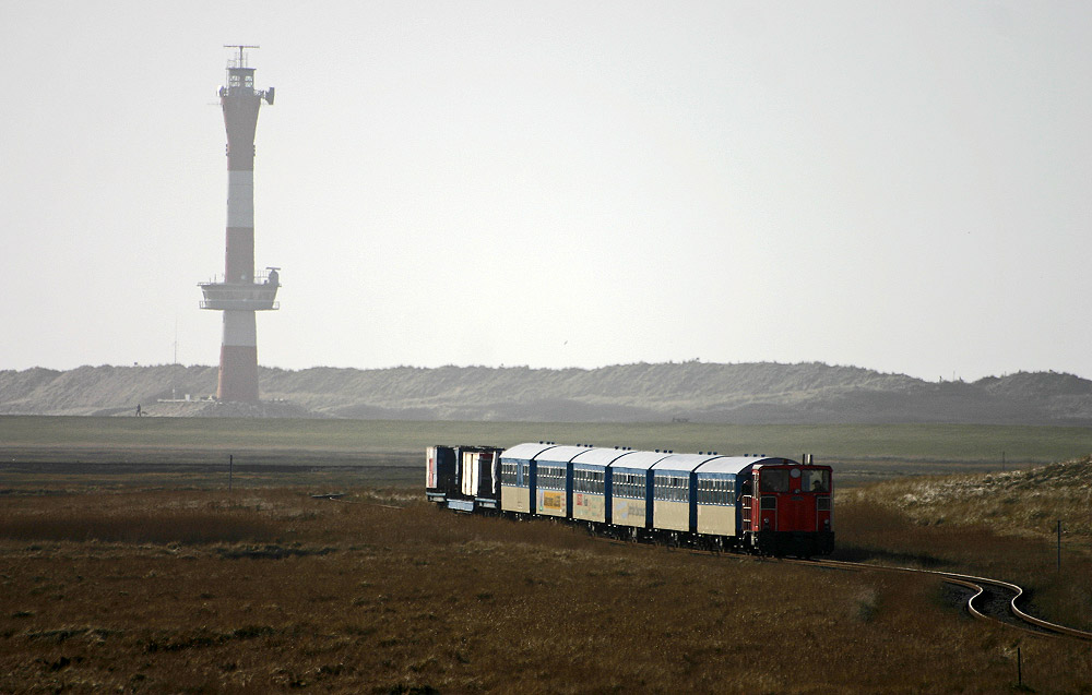Mit diesem proppevollen Inselbahnzug werden die Einwohner der anderen Inseln vom Westanleger zum Bahnhof gefahren. Den Großteil der Strecke hat der Zug bereits hinter sich gebracht.