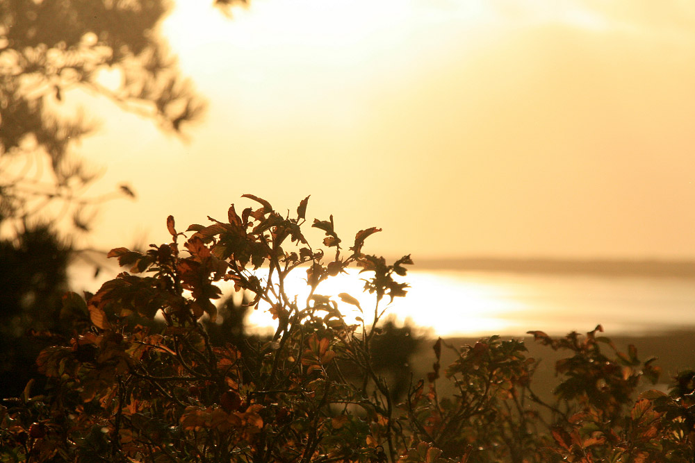 Golden schimmert das Watt, während die Blätter der Heckenrose langsam eine ebensolche Farbe annehmen.