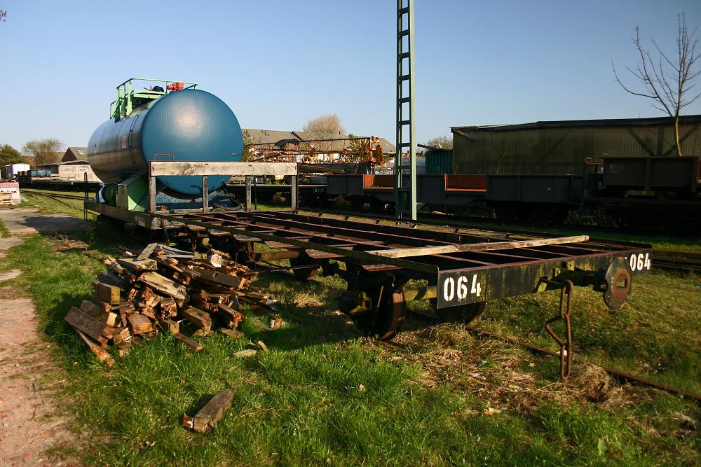 Der zweiachsige Güterwagen 63 064, der 1903 an die Großherzoglich Badischen Staatseisenbahnen ausgeliefert wurde und schließlich im Jahre 1973 auf die Insel kam, verlor kurz vor Aufnahme des Fotos seine Holzbohlen, welche noch immer davor liegen. Er steht allerdings auch schon längere Zeit unbenutzt auf einem Abstellgleis.