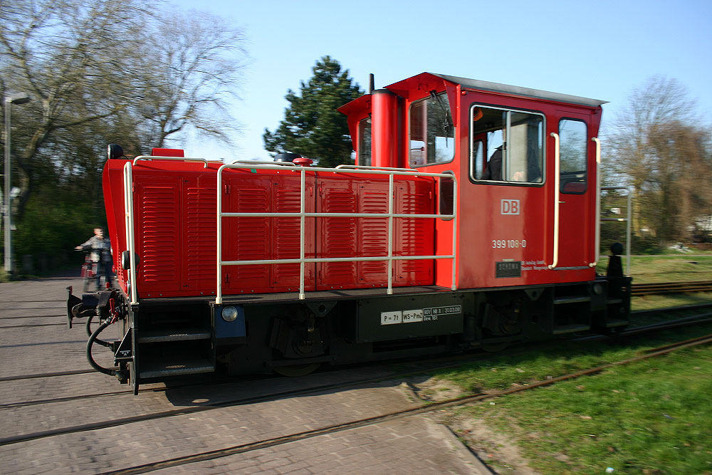 Eine der beiden Schöma-Loks passiert gerade den Bahnübergang. Durch Schlagen der Glocke macht sie auf sich aufmerksam.