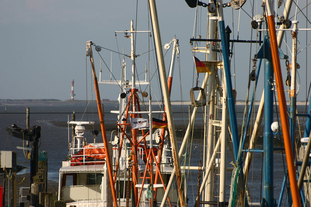 An den Masten und Auslegern einiger Fischkutter sowie an der ›Jens Albrecht III‹ vorbei blicken wir zur Insel Wangerooge. Im Hintergrund sehen Sie die »Harle Hörn«-Dünen und den Neuen Leuchtturm.