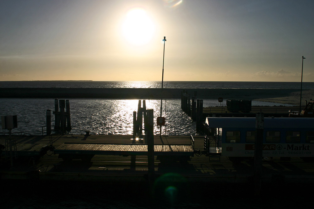 Aufgrund der späten Anreise geht die Sonne schon bald unter. Dafür schimmern das Meerwasser sowie die Holzplanken auf dem Flachwagen umso schöner.