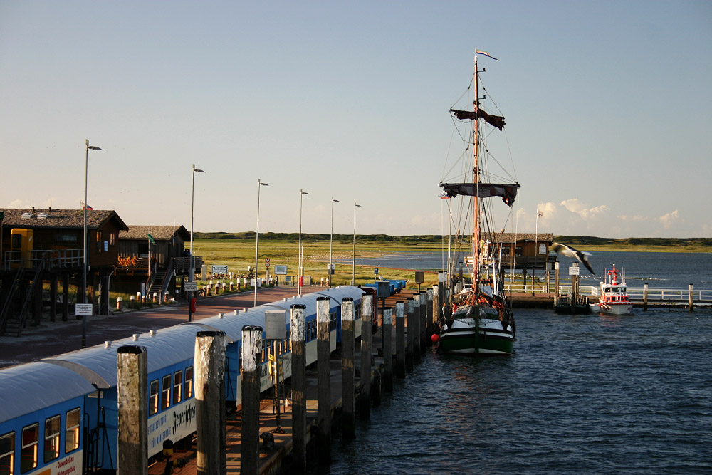 Die Sonne steht bereits recht tief und hüllt den Anleger in ein warmes Licht. Dazu ein großes Segelschiff, das Rettungsboot ›Wilma Sikorski‹ und die wartende Inselbahn. Und sogar eine fliegende Möwe hat sich aufs Foto verirrt.