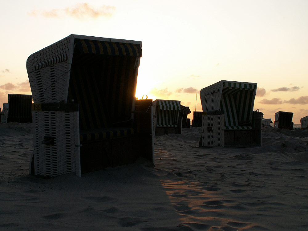 In einigen Minuten wird die Sonne untergegangen sein. Die Strandkörbe sind übrigens dem Osten zugewandt, damit sie einerseits mit dem Rücken zur Hauptwindrichtung stehen und andererseits die Morgensonne das Polster schnell trocknet.