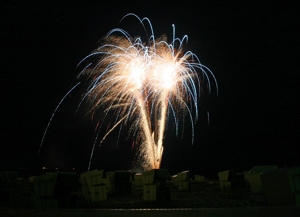 Jetzt folgten einige richtig hoch steigende, beeindruckende Feuerwerksbomben, die aber nicht in ganzer Pracht im Bild festgehalten werden konnten. Hier dann noch ein schöner Goldregen-Effekt, mit dem das gelungene Sommerfeuerwerk unter großem Applaus endete.