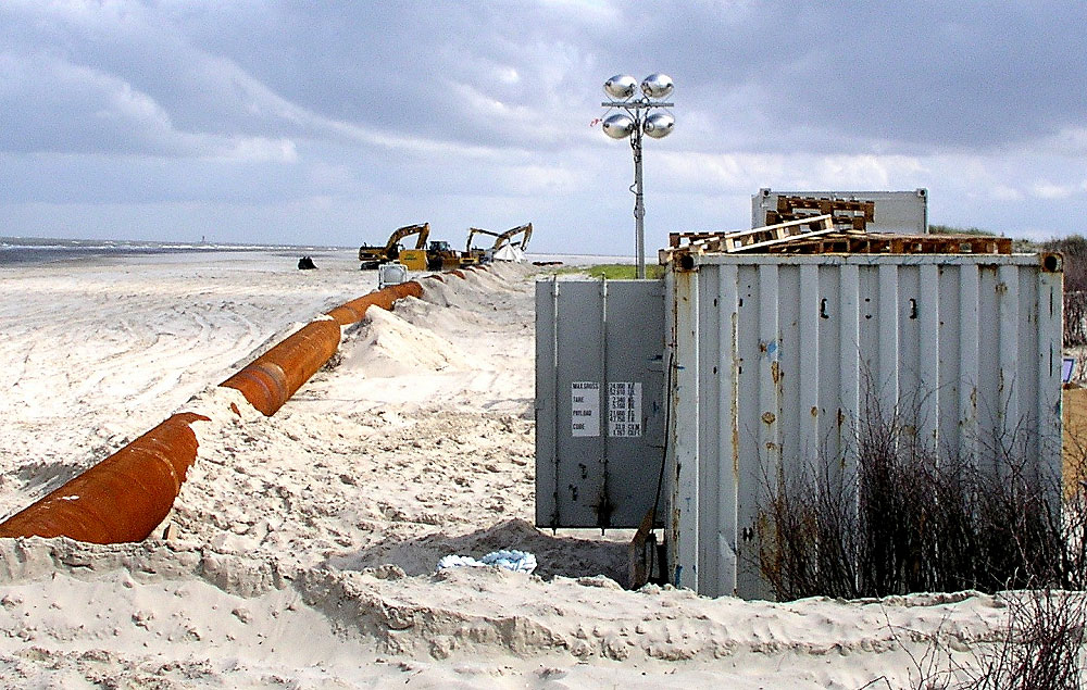 Dieses Spülrohr wird später per Schlepper auf See hinaus gezogen und an einen Übergabekopf angeschlossen werden, an den das Baggerschiff dann andocken kann, um den Wasser-Sand-Mix an Land zu spülen.
