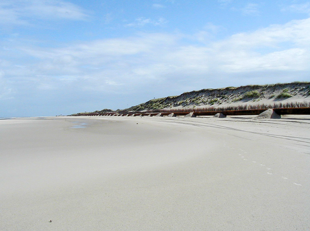Genau hier soll das Strandniveau durch die Aufspülung später einmal erhöht werden. Sie sehen es an den Dünen im Hintergrund, daß das Meer hier ordentlich an der Insel nagt.
