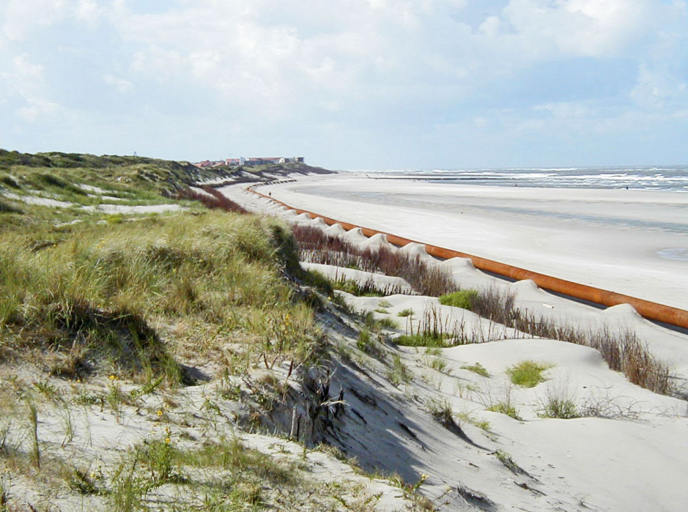 Ein Stückchen weiter östlich blicken wir hier aus den Dünen aufs Spülrohr, das zu einem einzigen Stück verschweißt wurde.