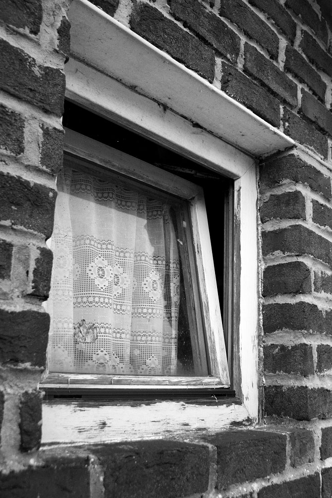 ‹ Ein doch sehr rustikales Holzfenster in einer ebenso rustikalen Wand.
