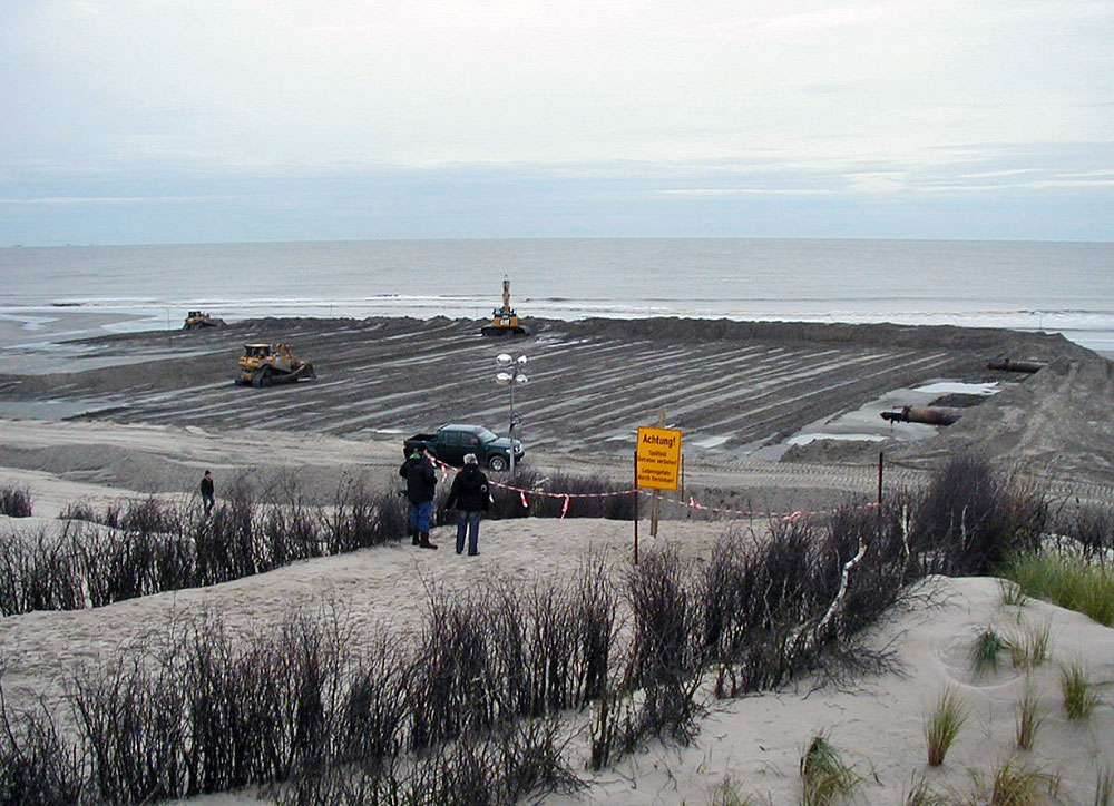 Hier mal wieder ein Foto von der Aufspülung am östlichen Strand. Und zwar haben wir hier von der Überwegung »Radarstation« einen schönen Blick auf das Spülfeld. Mit Bagger und Planierraupen wird der Sand hier profilgerecht verteilt.