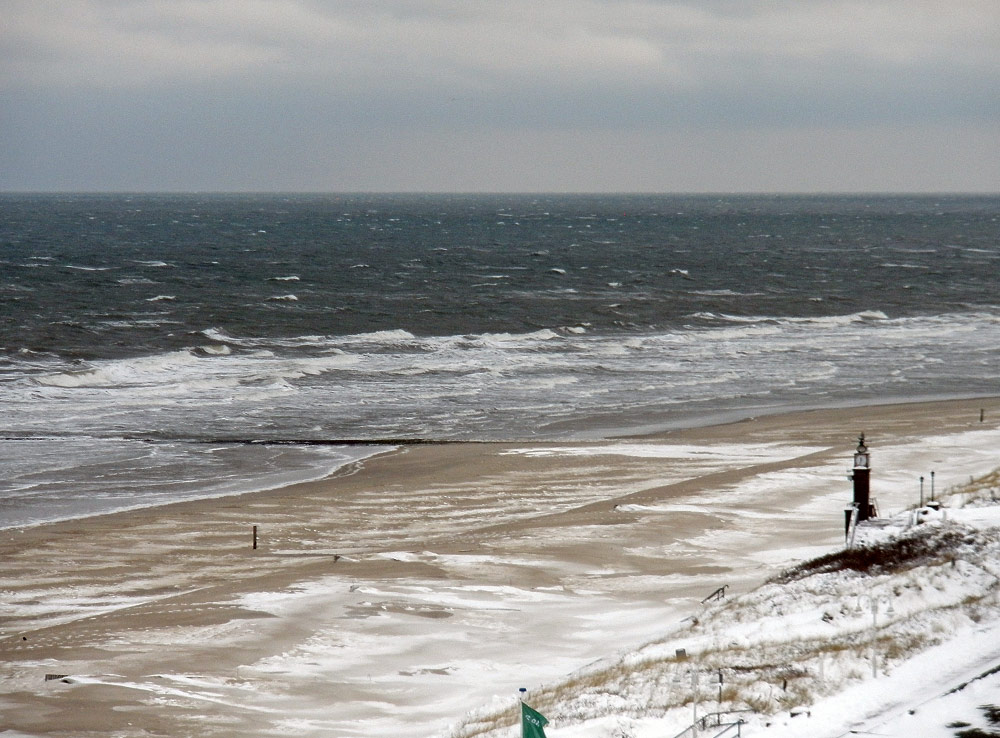 Der verwaiste, winterliche Hauptstrand von der Marine-Signalstation aus gesehen.