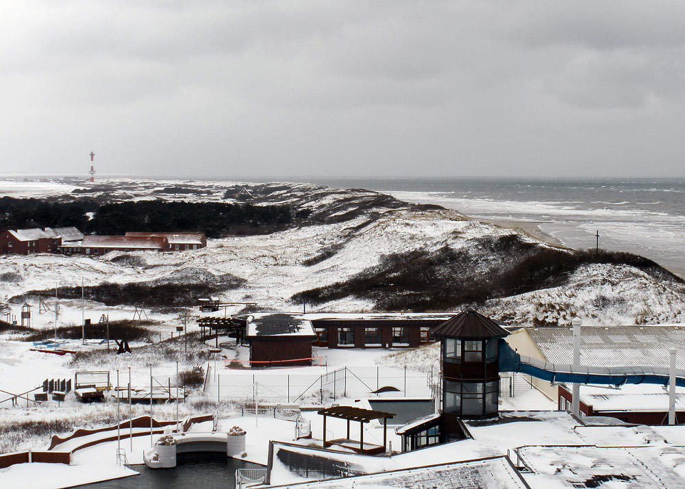 Unten im Bild sehen Sie den Außenbereich des Meerwasser-Freizeitbades »Oase« mit Riesenrutsche und Außenschwimmbecken. Rechts, hinter der Rutsche, befindet sich außerdem die Strandkorbhalle.