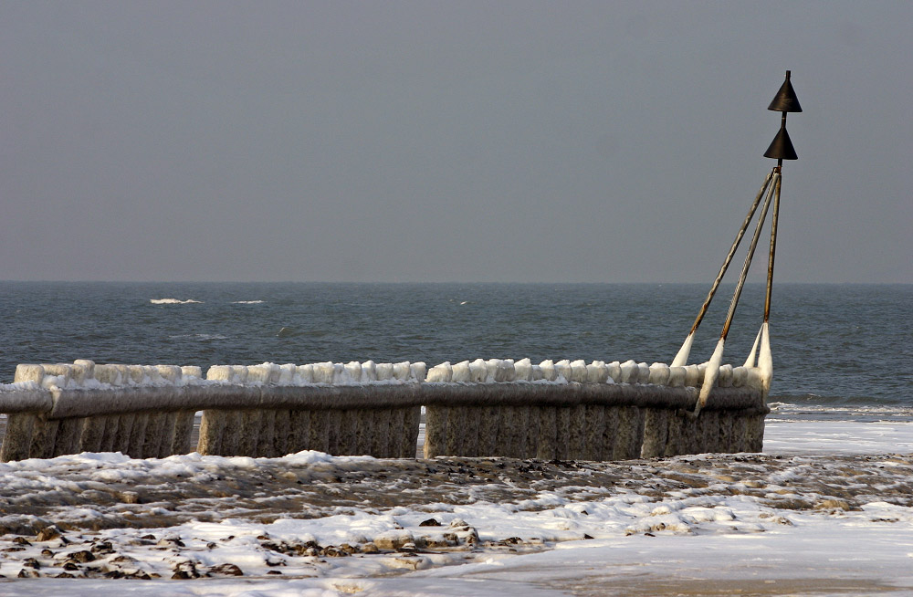 Direkt neben der Buhne »M« befindet sich eine Pfahlbuhne. Sie trägt aufgrund der sehr kalten Temperaturen der letzten Tage eine dicke Eisschicht.