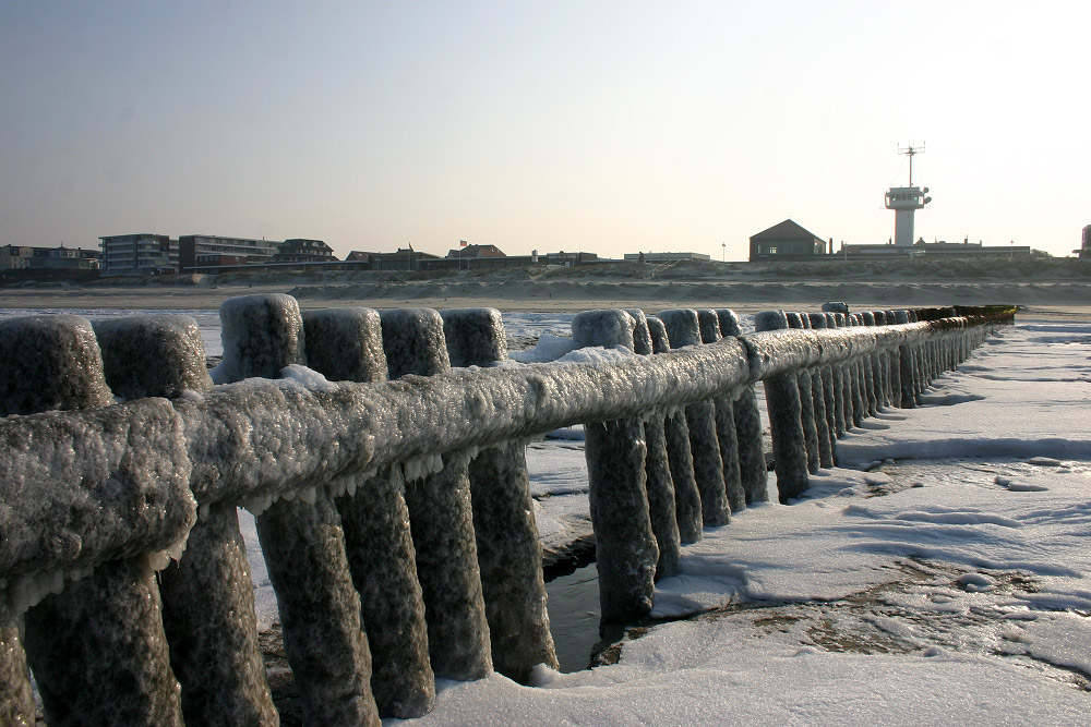 Tiefster Winter am Wangerooger Hauptstrand. Hier noch einmal die Pfahlbuhne »M« mit Signalstation und Servicegebäude im Hintergrund.