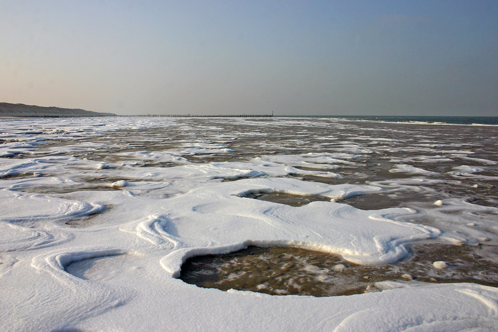 Eine einzige vereiste Fläche bildet der Strand westlich des Hauptstrandes hier im Januar 2010, dazu herrlichstes Winterwetter.
