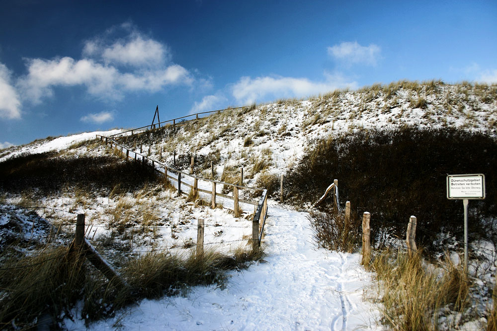 Die Überwegung »Bielefelder Heim« liegt direkt vor uns. Direkt hinter den Dünen befindet sich auch schon der Strand, eine Treppe führt dorthin hinunter.