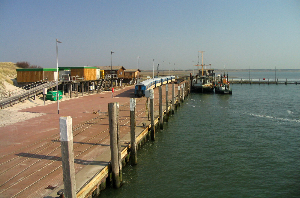 Vor einigen Sekunden hat die Fähre vom Westanleger abgelegt, zurück bleibt die Inselbahn mit den sechs Waggons und natürlich – auch wenn sie nicht im Bild sind – der Lok und einigen Flachwagen.