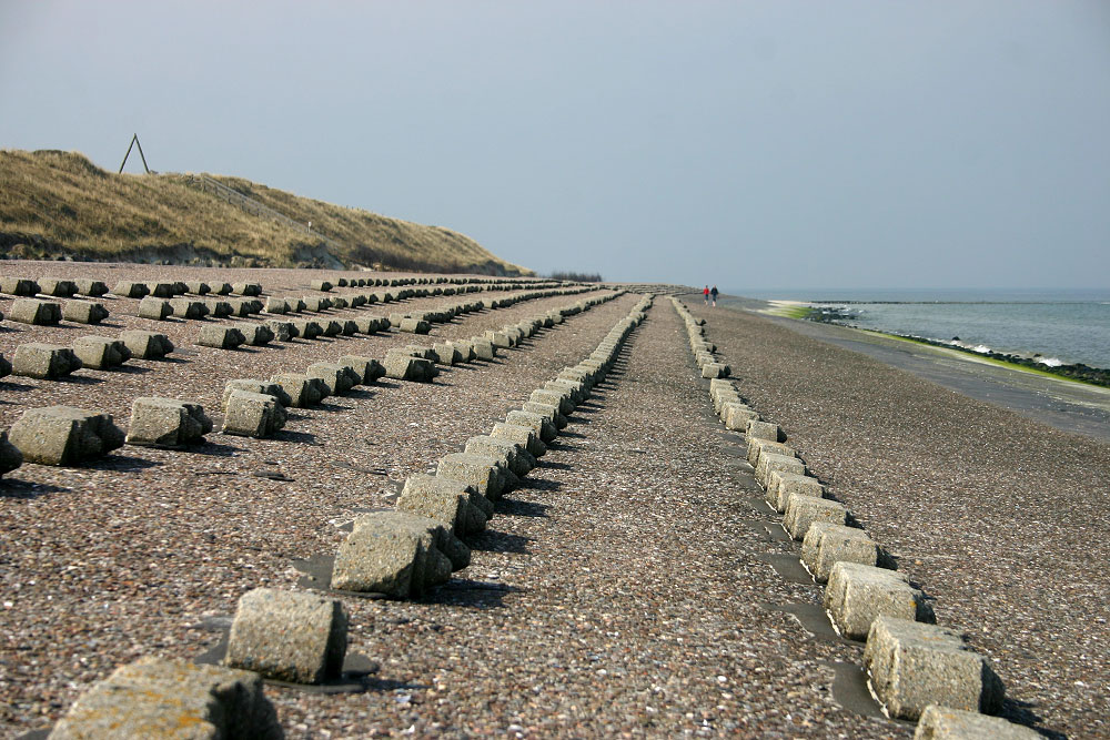 Das »Nordwestlängswerk«, auf dem wir uns momentan befinden, ist ein wenig flacher als das Deckwerk im Westen. Dementsprechend häufig wird es überspült, was den Dünen, die sich dahinter befinden, nicht unbedingt gut tut.