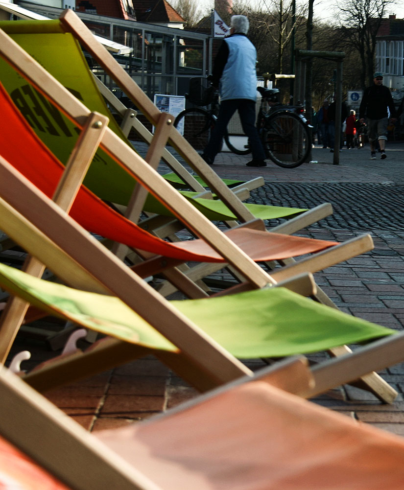 Hier am oberen Ende der »Zedeliusstraße« stehen ein paar farblich gut harmonierende Liegestühle – sie gehören zum Restaurant »Pirat«.