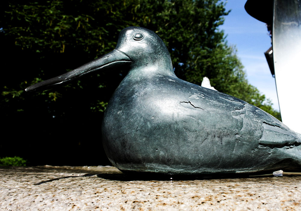 Mehrere Austernfischer zieren den Brunnen auf dem Appellplatz, dies ist einer von ihnen.