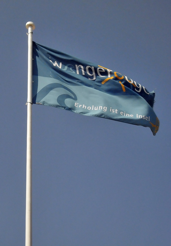 ‹ Auf den beiden Flaggen links und rechts der Uhr sind das Wangerooge-Logo sowie der Slogan »Erholung ist eine Insel« zu lesen. Bei den anderen Flaggen an der Strandpromenade handelt es sich um die der einzelnen Bundesländer.