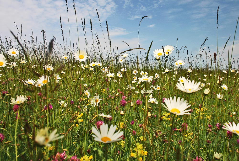 Eine richtige Wildwiese mit Margeriten, Klee, verschiedenen Gräsern und weiteren Wildblumen entsteht, wenn der Deich längere Zeit nicht gemäht wird.