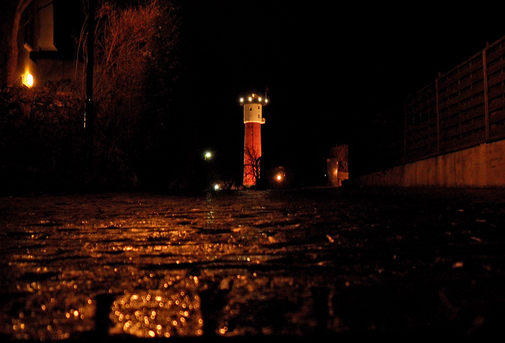 Die nächtliche »Robbenstraße« mitten im Dorf. Der leichte Nieselregen läßt das Licht auf dem Pflaster reflektieren.