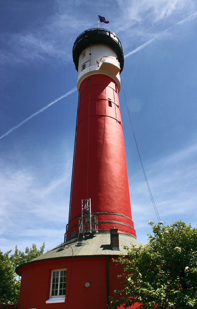 ‹ Ein Kondensstreifen kreuzt die Spitze des Alten Leuchtturms, die auch ein Standesamt beherbergt. Erst vor wenigen Minuten fand dort eine Trauung statt, in dieser Zeit sind Turmbesteigungen leider nicht möglich.