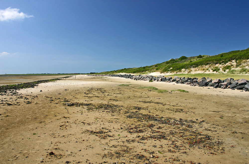 Ein Blick zurück in Richtung Westen, während wir uns immer weiter dem Ostende nähern. Auf dem Steindamm links fuhr bis 1958 noch die Inselbahn, man konnte vom Ostanleger aus etwa nach Wilhelmshaven oder Bremen fahren.