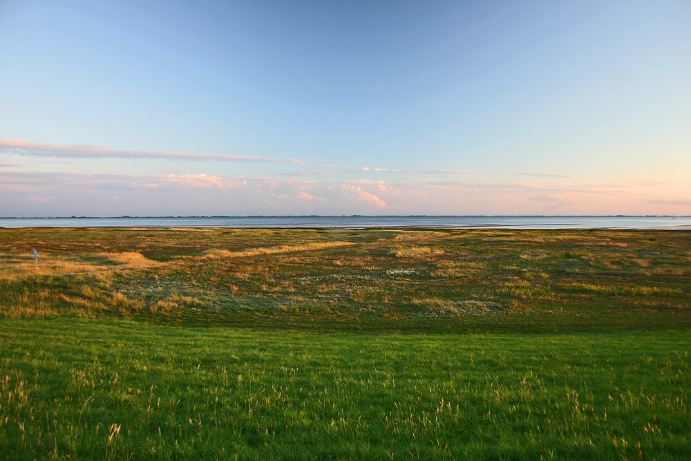 Das Deichvorland wird ganz schwach von der mittlerweile fast untergegangenen Sonne beschienen. Es entsteht eine eigentümliche Lichtstimmung mit vielen satten Farben.