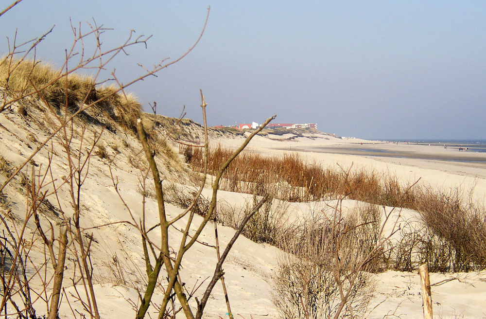 Ein Blick aus den Nordostdünen, am Buschzaun vorbei, in Richtung Hauptstrand und Dorf. Das schöne Wetter lädt geradezu zum Strandspaziergang ein.