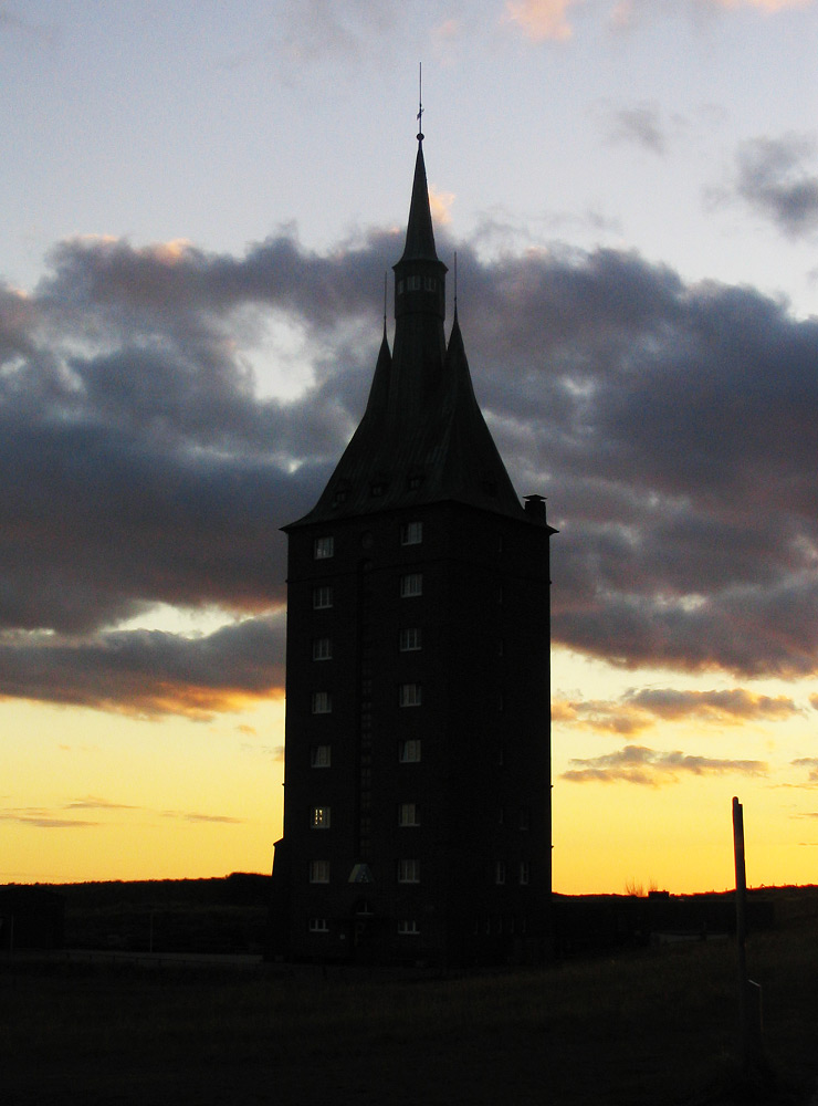 ‹ Die Silhouette des Westturms, dem Wahrzeichen der Insel, zeichnet sich vor dem leuchtenden Abendhimmel ab.