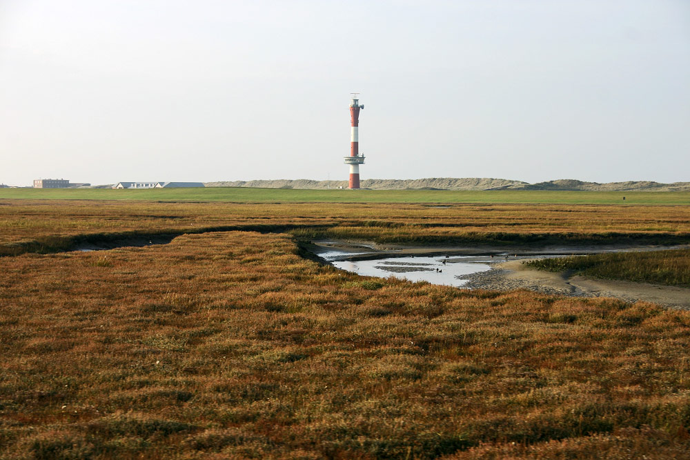 Die Lagune im Westaußengroden ist durchsetzt mit Prielen. Dahinter sehen wir den Neuen Leuchtturm und die Nordwestdünen.