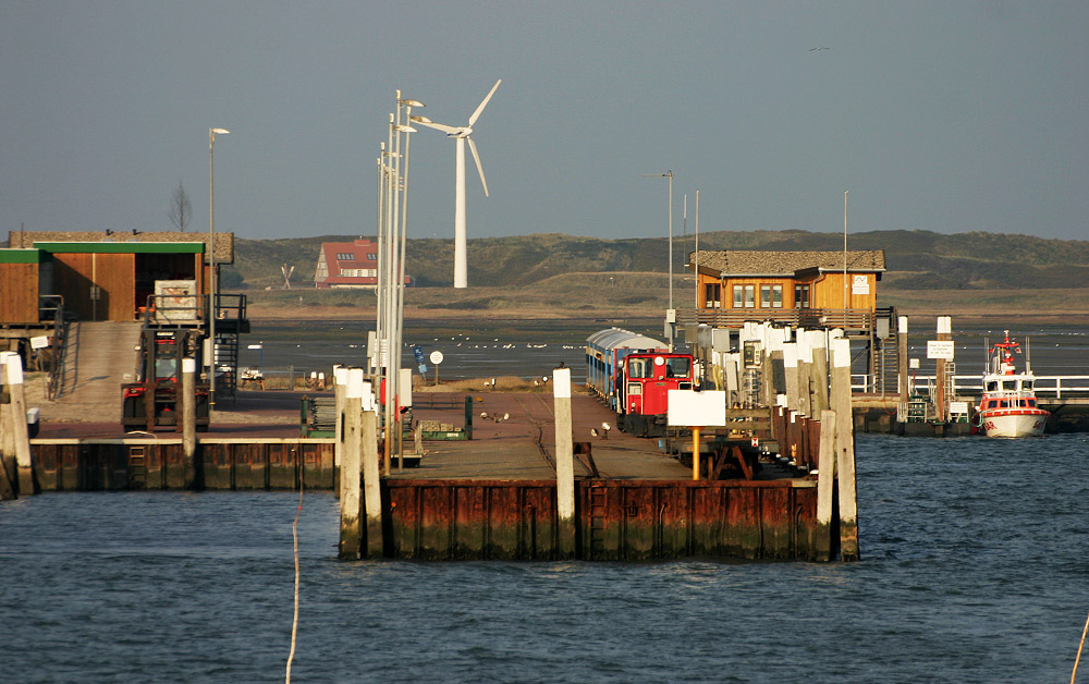 Der Westanleger sieht auf dieser Aufnahme ganz schön kurz aus. Die Inselbahn wird sich gleich wieder auf den Weg in Richtung Dorf machen, die Salinebucht (im Hintergrund) in einem Bogen umrundend.