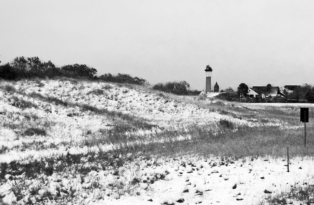 Gleich werden wir im Inseldorf ankommen, der Alte Leuchtturm ist schon sehr nah. Und auch hier ist alles schön verschneit, was relativ ungewöhnlich für Ende Oktober ist. Um nicht zu sagen total ungewöhnlich.